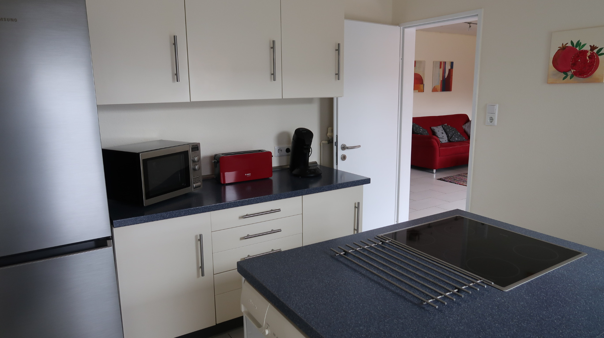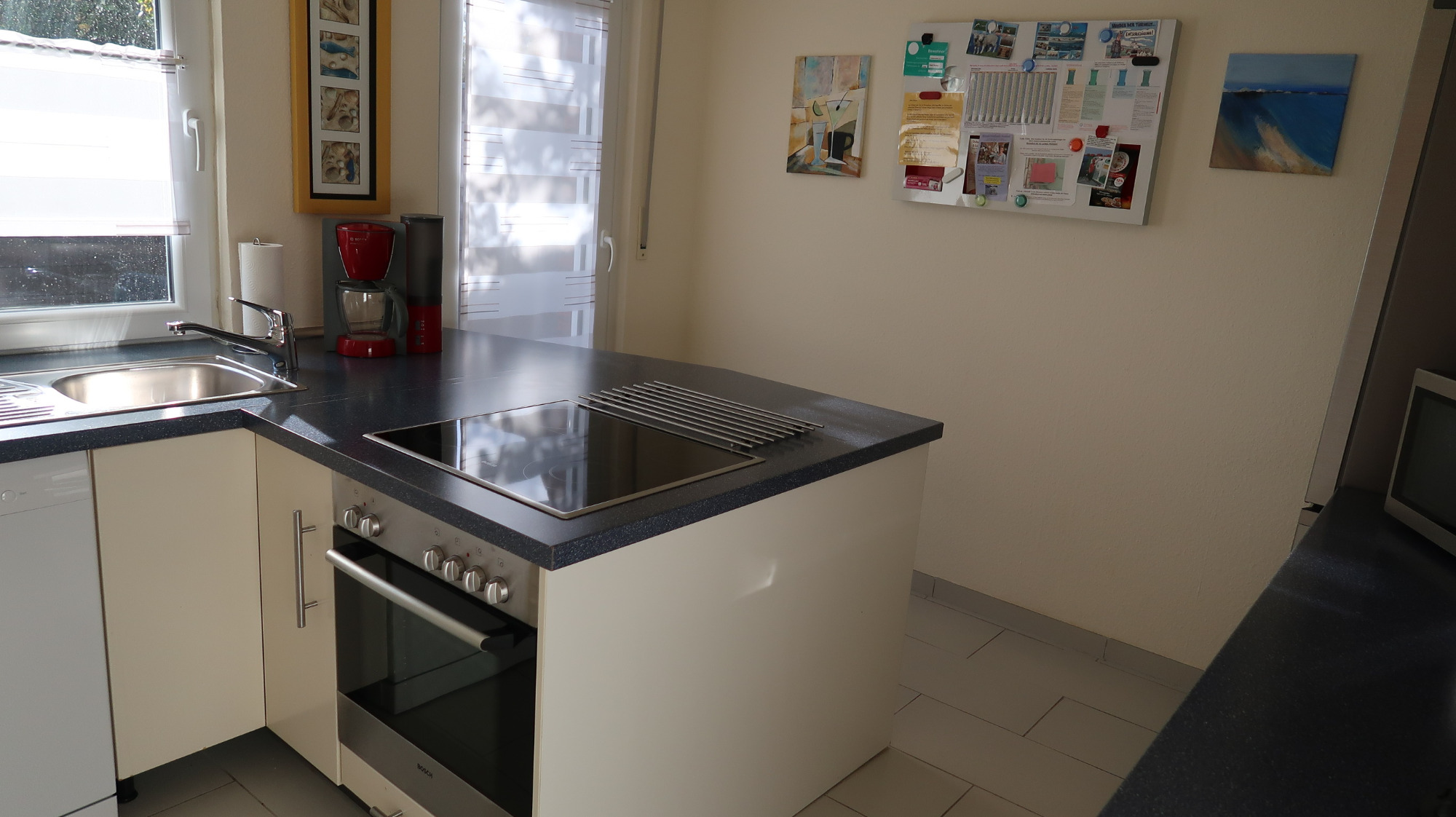 In der Küche finden Sie eine Geschirrspülmaschine, Kaffee- und Senseomaschine, eine Mikrowelle sowie ein Cerankochfeld und einen Umluftbackofen sowie eine Waschmaschine und eine Kühlgefrierkombination.